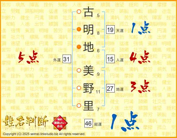 古(5画)明(8画)地(6画) 美(9画)野(11画)里(7画)