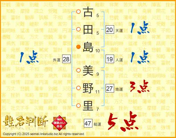 古(5画)田(5画)島(10画) 美(9画)野(11画)里(7画)