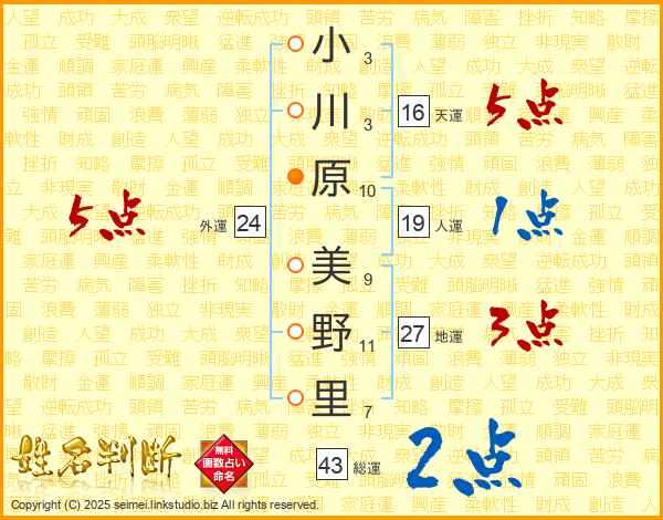 小(3画)川(3画)原(10画) 美(9画)野(11画)里(7画)