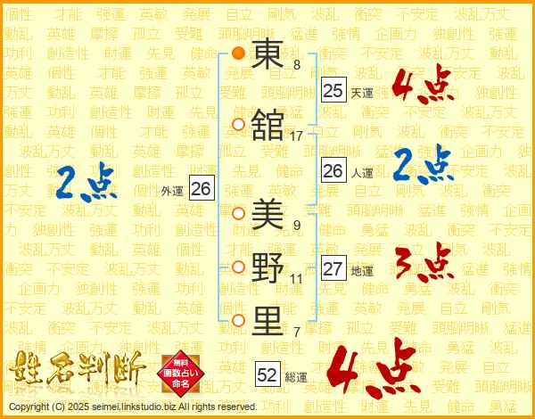東(8画)舘(17画) 美(9画)野(11画)里(7画)