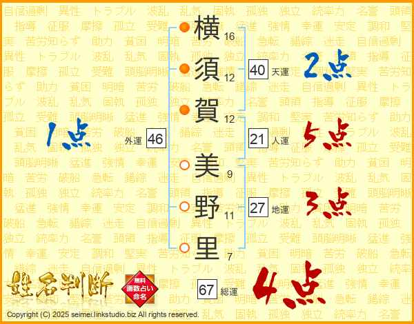 横(16画)須(12画)賀(12画) 美(9画)野(11画)里(7画)