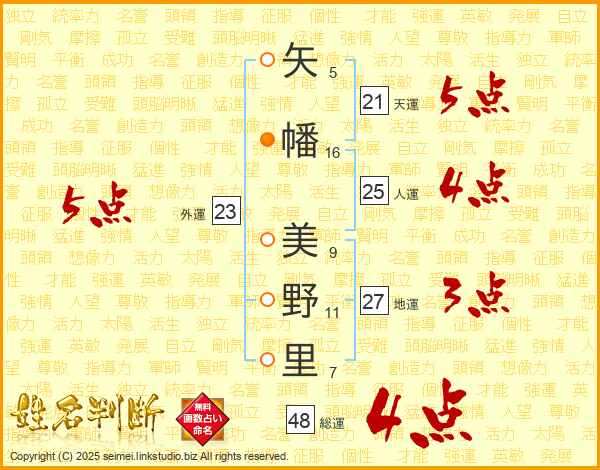 矢(5画)幡(16画) 美(9画)野(11画)里(7画)