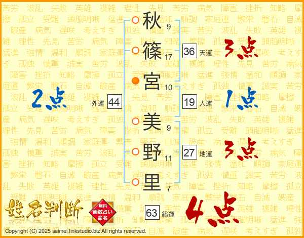 秋(9画)篠(17画)宮(10画) 美(9画)野(11画)里(7画)