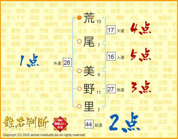 荒(10画)尾(7画) 美(9画)野(11画)里(7画)