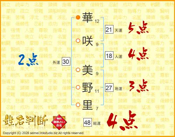 華(12画)咲(9画) 美(9画)野(11画)里(7画)