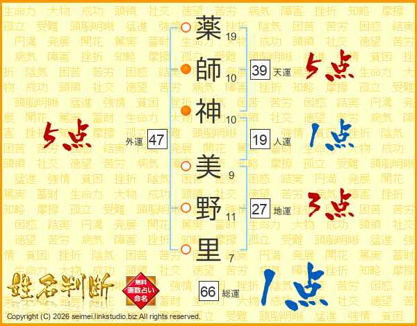 薬(19画)師(10画)神(10画) 美(9画)野(11画)里(7画)