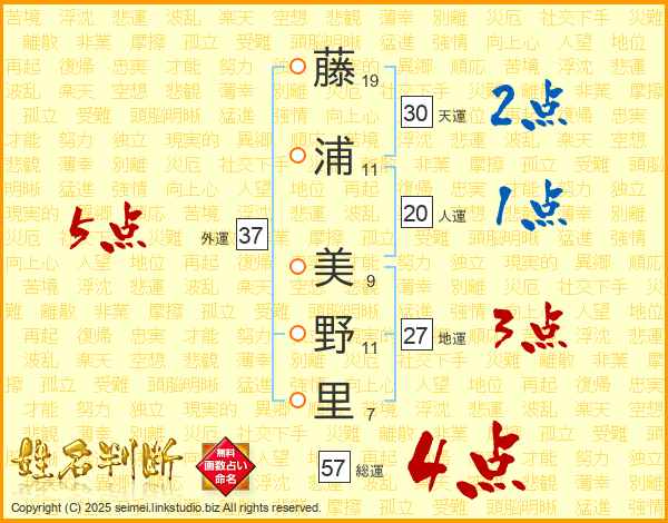 藤(19画)浦(11画) 美(9画)野(11画)里(7画)