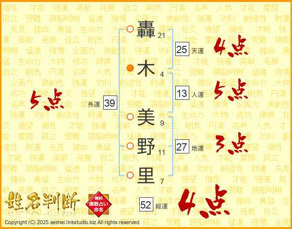 轟(21画)木(4画) 美(9画)野(11画)里(7画)