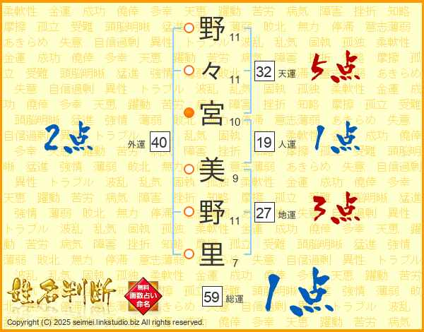 野(11画)々(11画)宮(10画) 美(9画)野(11画)里(7画)