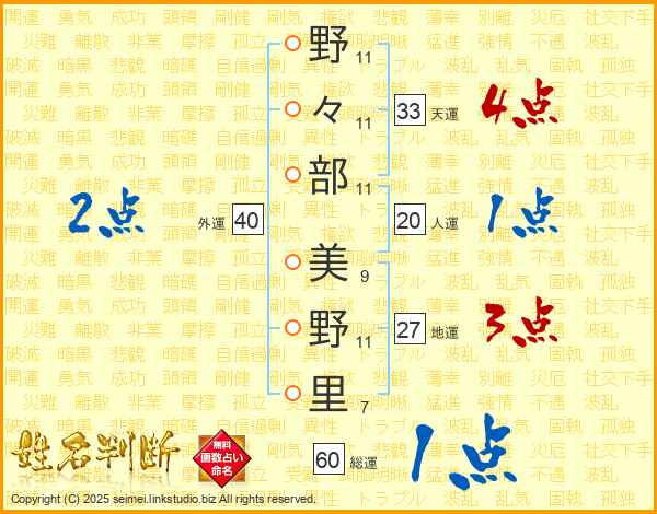 野(11画)々(11画)部(11画) 美(9画)野(11画)里(7画)
