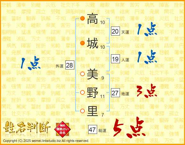 高(10画)城(10画) 美(9画)野(11画)里(7画)