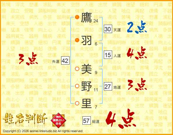 鷹(24画)羽(6画) 美(9画)野(11画)里(7画)