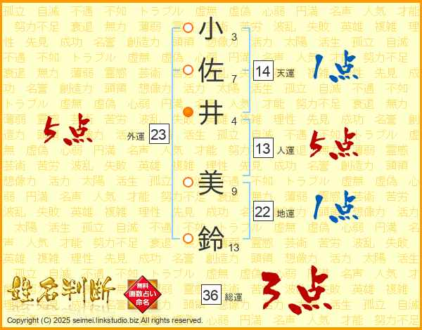 小(3画)佐(7画)井(4画) 美(9画)鈴(13画)