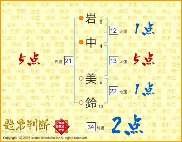 岩(8画)中(4画) 美(9画)鈴(13画)