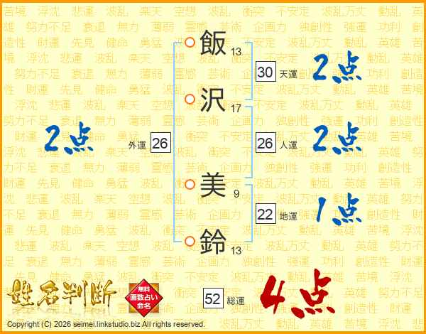 飯沢美鈴さんの総運は52画の4点!