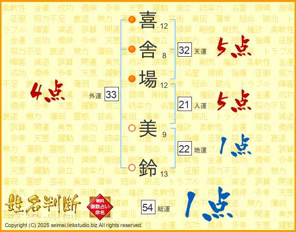 喜(12画)舎(8画)場(12画)  美(9画)鈴(13画)