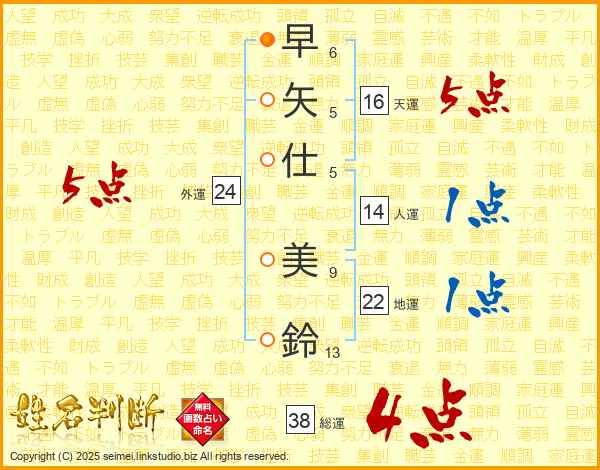 早(6画)矢(5画)仕(5画) 美(9画)鈴(13画)
