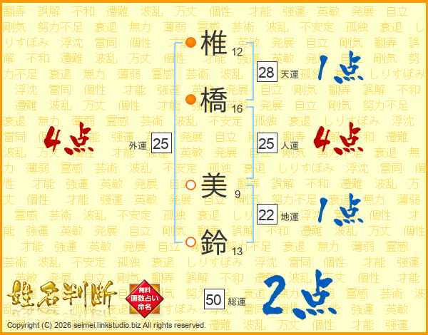 椎(12画)橋(16画) 美(9画)鈴(13画)
