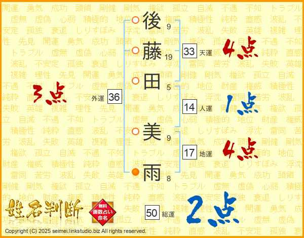 後(9画)藤(19画)田(5画) 美(9画)雨(8画)