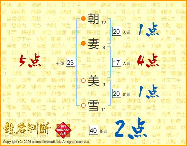朝(12画)妻(8画) 美(9画)雪(11画)