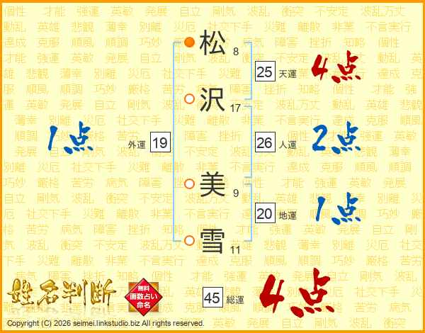 松(8画)沢(17画) 美(9画)雪(11画)