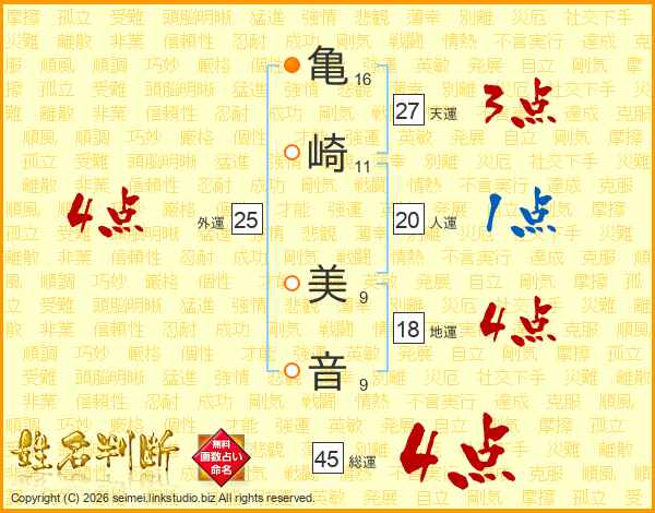 亀(16画)崎(11画) 美(9画)音(9画)