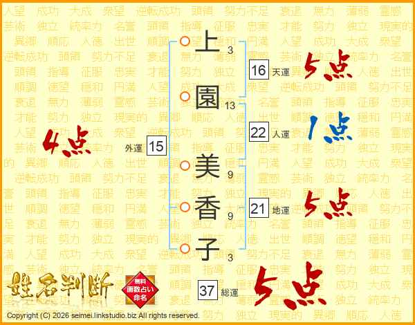 上(3画)園(13画) 美(9画)香(9画)子(3画)
