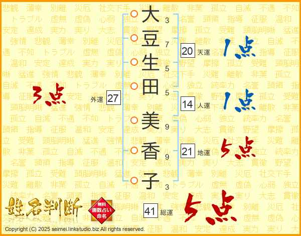 大(3画)豆(7画)生(5画)田(5画) 美(9画)香(9画)子(3画)