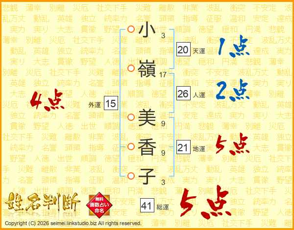 小(3画)嶺(17画) 美(9画)香(9画)子(3画)