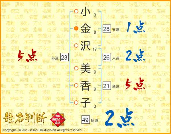 小(3画)金(8画)沢(17画) 美(9画)香(9画)子(3画)