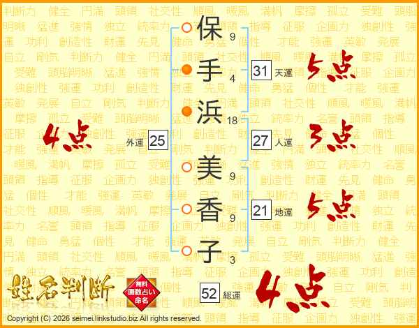 保(9画)手(4画)浜(18画)  美(9画)香(9画)子(3画)