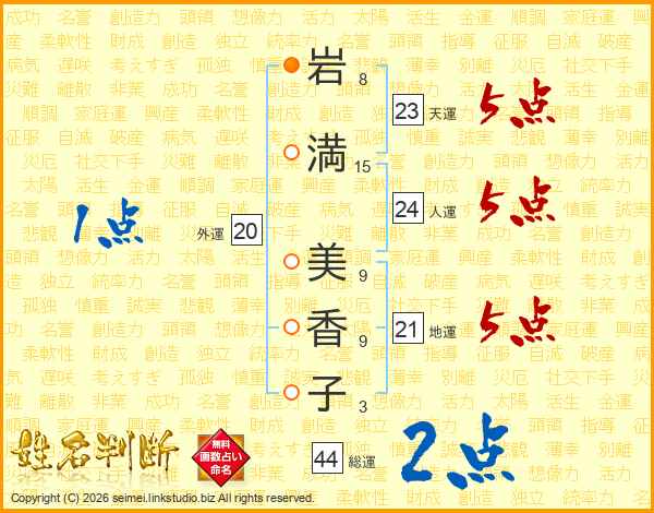 岩(8画)満(15画) 美(9画)香(9画)子(3画)