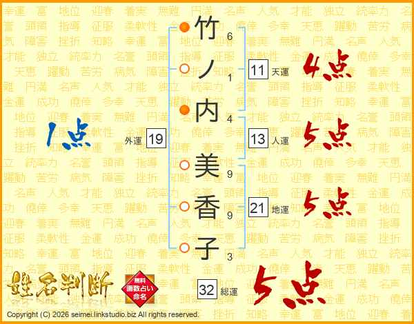 竹(6画)ノ(1画)内(4画) 美(9画)香(9画)子(3画)