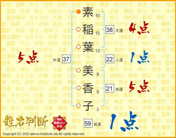 素(10画)稲(15画)葉(13画) 美(9画)香(9画)子(3画)