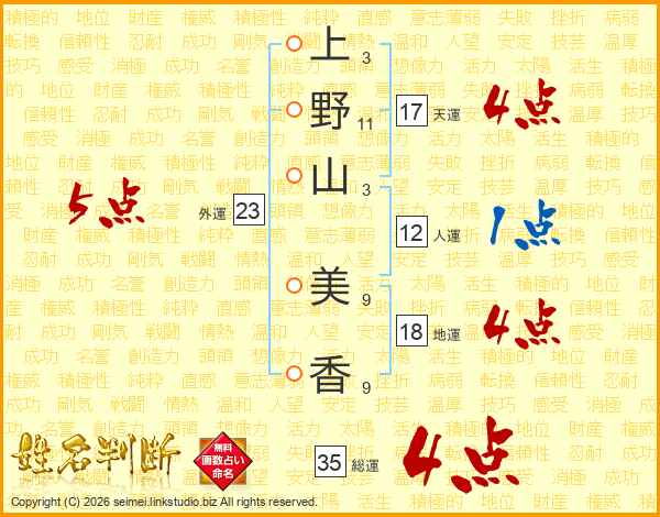 上(3画)野(11画)山(3画) 美(9画)香(9画)