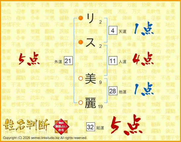 リ(2画)ス(2画) 美(9画)麗(19画)