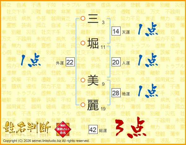 三(3画)堀(11画) 美(9画)麗(19画)