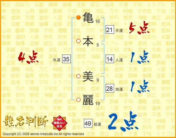 亀(16画)本(5画) 美(9画)麗(19画)