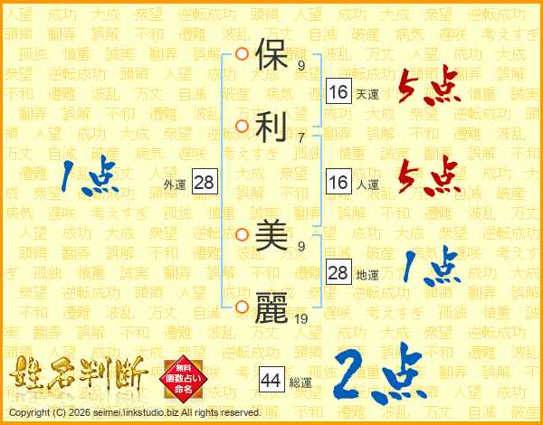 保(9画)利(7画) 美(9画)麗(19画)