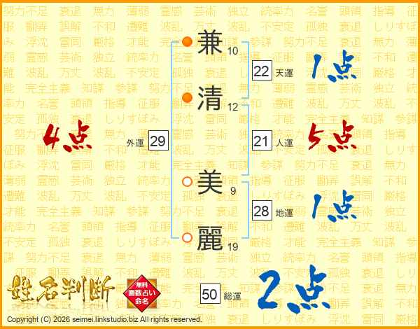 生活面を象徴する運勢です。外部から受ける影響力を表し、結婚運、家庭運や職場、環境への順応性を表します。総運から人運を引いた画数。姓や名が1文字の場合を除く。