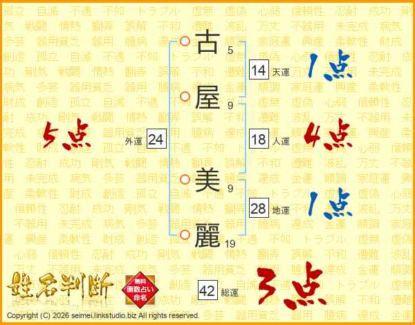 生活面を象徴する運勢です。外部から受ける影響力を表し、結婚運、家庭運や職場、環境への順応性を表します。総運から人運を引いた画数。姓や名が1文字の場合を除く。