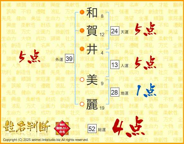 和(8画)賀(12画)井(4画) 美(9画)麗(19画)
