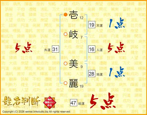 壱(12画)岐(7画) 美(9画)麗(19画)