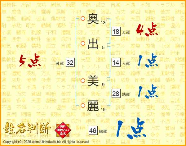 生活面を象徴する運勢です。外部から受ける影響力を表し、結婚運、家庭運や職場、環境への順応性を表します。総運から人運を引いた画数。姓や名が1文字の場合を除く。