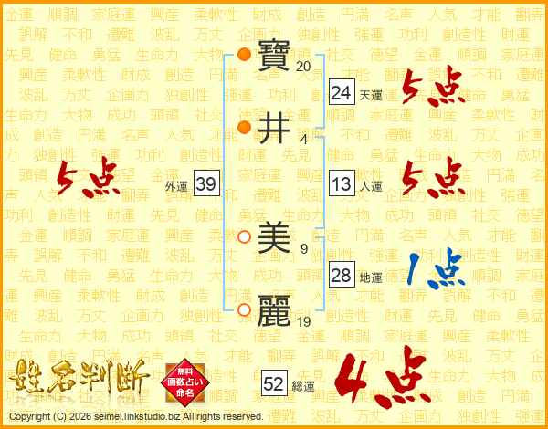 寶(20画)井(4画) 美(9画)麗(19画)