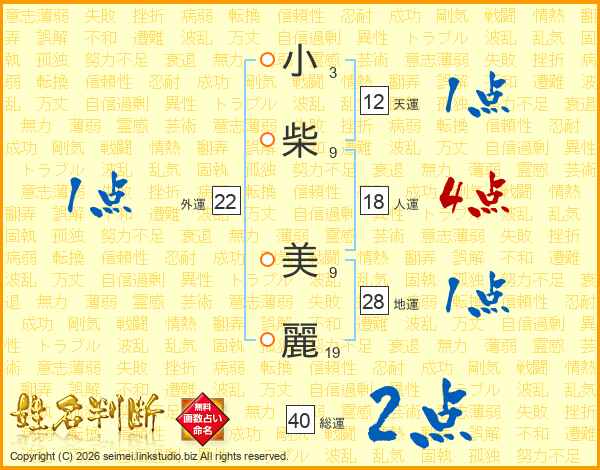 生活面を象徴する運勢です。外部から受ける影響力を表し、結婚運、家庭運や職場、環境への順応性を表します。総運から人運を引いた画数。姓や名が1文字の場合を除く。