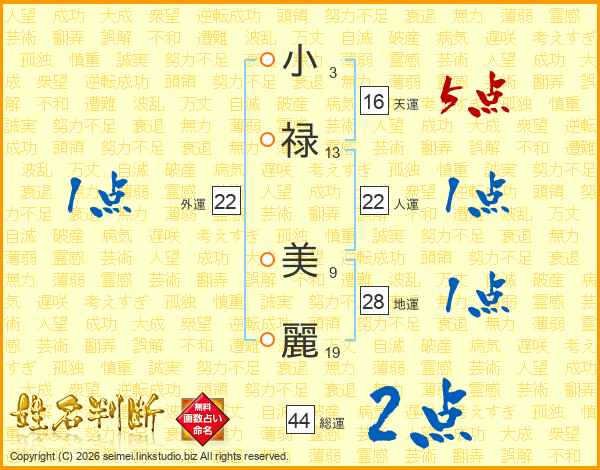小(3画)禄(13画) 美(9画)麗(19画)