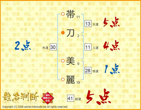 帯(11画)刀(2画) 美(9画)麗(19画)