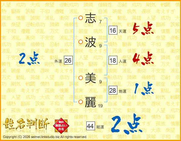 あなたの人生を表す1番重要な運勢です。生涯を通じて影響する総合運となり、主に50歳以降の晩年期に影響を及ぼします。苗字と名前の合計画数。