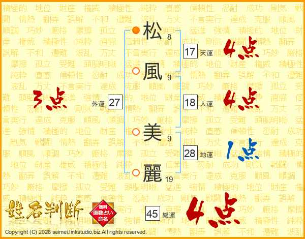 生活面を象徴する運勢です。外部から受ける影響力を表し、結婚運、家庭運や職場、環境への順応性を表します。総運から人運を引いた画数。姓や名が1文字の場合を除く。
